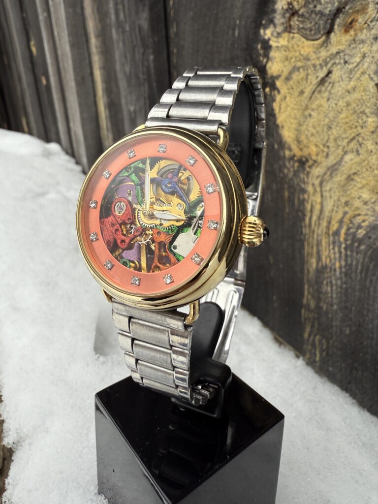 Another truly unique and original piece, Creatures is the second time gage in the Transitions Series. Besides being a tremendous challenge, skeletonizing, carving and inking the three creatures into the main plate of this CH2650G manual winding movement has been loads of fun! In action, the balance wheel forms a halo around the red creature’s head, who’s hand looks like it is driving the escape wheel. The blue creatures leisurely flies out of the main spring coils as the orange fox-bird creature stares up at them in awe…