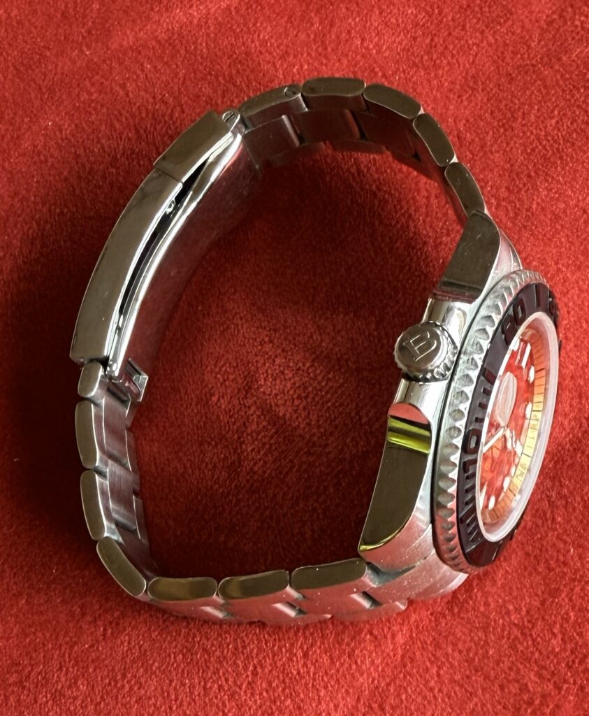 Since it is a Fire Department motif, the dial of this 40 mm submariner style gage is made out of the same reflective material that we use on our vehicles and apparatus. The case back is electro-etched with the GPF logo and model/series information. It has a sapphire crystal, screw crown, ceramic bezel insert and stainless bracelet (also electro-etched with the GPF logo. The movement is a Seiko automatic.