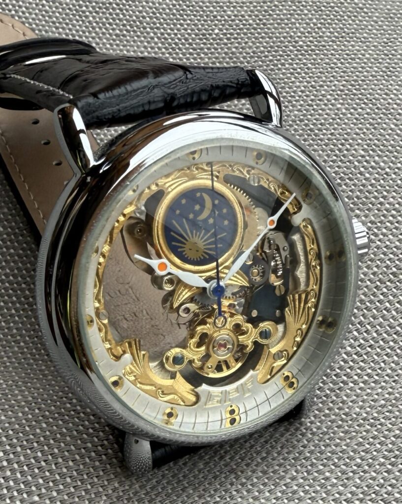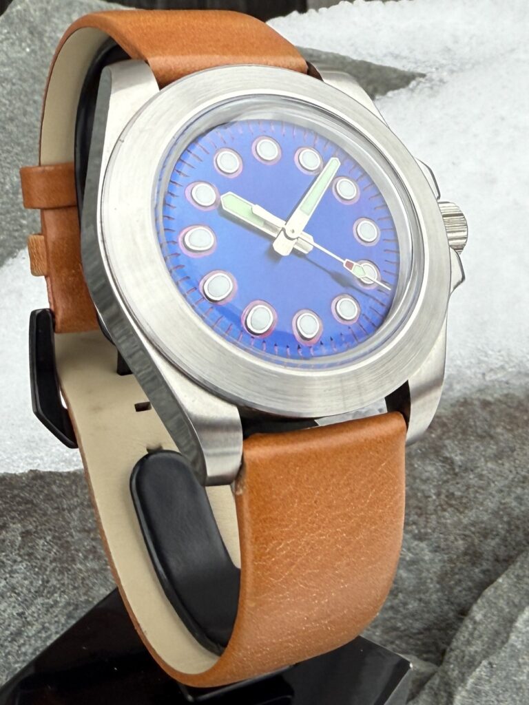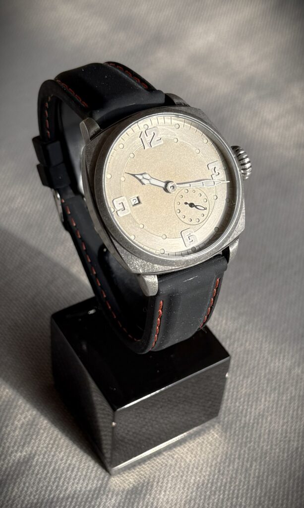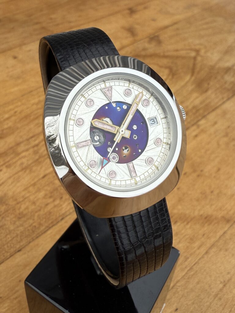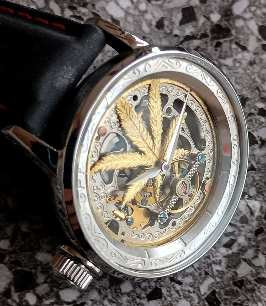 Practice Pieces These more affordable time gages are the result of my experimenting with different designs, materials and building techniques… They are nice watches, but not as complicated or involved as GPF Originals. N-FDA #3A 37 mm cushion cased time gage with a unique dial made out of a computer hard drive circuit board.Seagull automatic movement. $ 180Includes box, papers, stainless bracelet and shipping to the USA————————————————————————- GPF Pure Skeleton #7 A 45 mm time gage with a uniquely skeletonized movement.Seagull manual wind movement. $ 260Includes box, papers, leather strap and shipping to the USA———————————————————————– Lone Ranger“Hi-Yo, Silver!!!”A modified StarKing high beat with a killer dial.Seagull automatic movement. $ 280Includes travel roll, papers, rubber strap and shipping to the USA————————————————————————– Militia #5 A heavy duty, tactical grade time gage.Miyota automatic movement. $ 390Includes winder, papers, leather strap and shipping to the USA———————————————————————– Up in Smoke A time gage that celebrates the use of Cannabis.Hangzhou manual wind movement. $ 360Includes travel roll, papers, silicone rubber strap and shipping to the USA———————————————————————– TiDi #1 A tank case time gage with a hammered, flame painted titanium dial.Miyota quartz movement. $ 120Includes papers, leather strap and shipping to the USA———————————————————————– N-FDA#1 A tank case time gage with a hammered, flame painted titanium dial.Miyota quartz movement. $ 180Includes papers, leather strap, stainless bracelet and shipping to the USA———————————————————————– TiDi#2Time only gage featuring a double anodized titanium dial.Seiko automatic movement. $ 380Includes travel roll, papers, leather strap and shipping to the USA————————————————————————- N-SSA#1 Nino Series Semi-Skeleton with a hand made skeletonized dial over a modified Miyota automatic movement. $ 180Includes papers, leather strap, stainless bracelet and shipping to the USA———————————————————————– Buler Mod A vintage Buler time gage with a skeletonized dial revealing a marvel only a watchmaker would otherwise have seen.FHF automatic movement. $ 140Includes papers, leather strap, and shipping to the USA———————————————————————– Home PageAbout GPFOn the BenchArchive GalleryWristwatches for SaleContact
