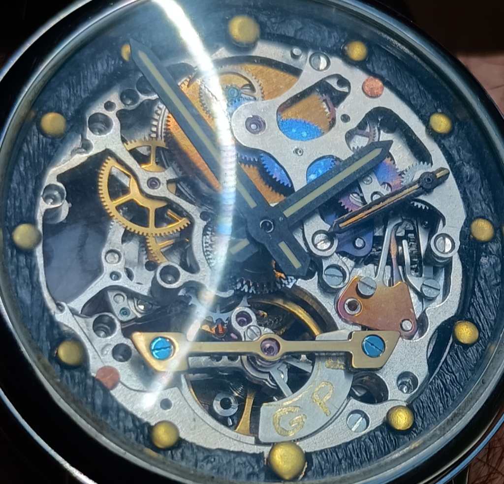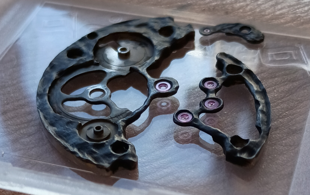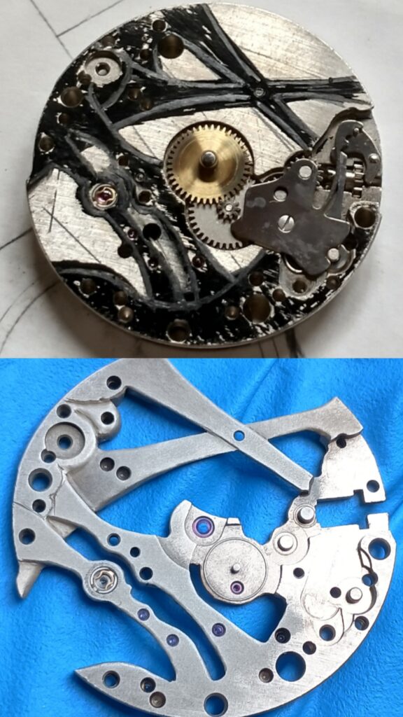 Next, the sketched pattern is cut out with great care using a miniature watchmaker’s saw. Tooling marks left over by the saw blade are then filed smooth with needle files. It is these hours of filing that give the cutout curves their final shape. Next, tiny chisels for metal, called gravers, are employed in carving out or engraving more detailed designs into the skeletonized parts. The skeletonization truly starts changing dramatically during this step. Depending on which would better bring out and enhance the way light reflects off the work, the last step is the surface finishing. This may be a brushed effect, a polished look, or the light etching of a pattern. A further option that can enhance a skeletonization is the chemical alteration of the base metal itself, be it through the process of silvering, electroplating, anodization and/or oxidation.