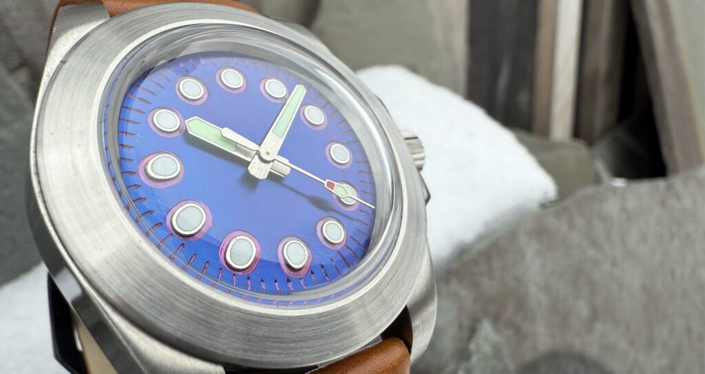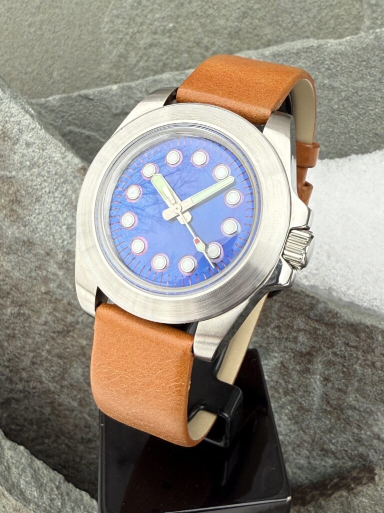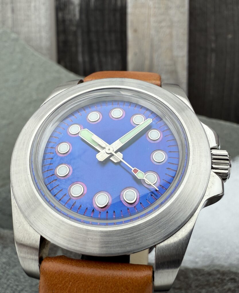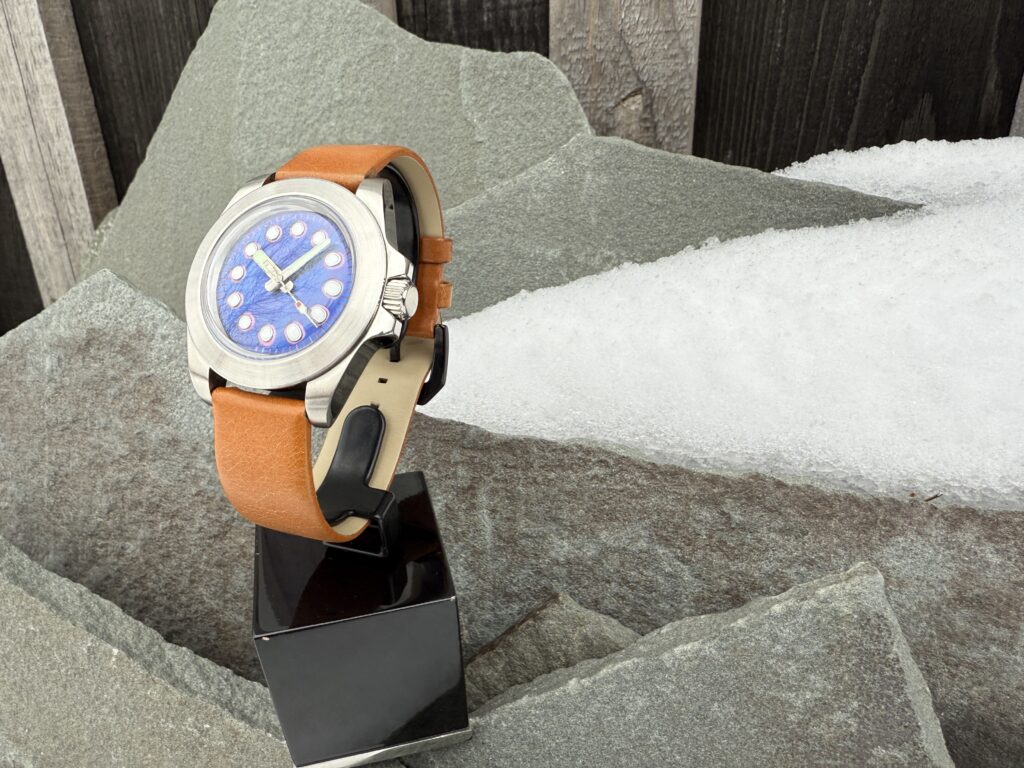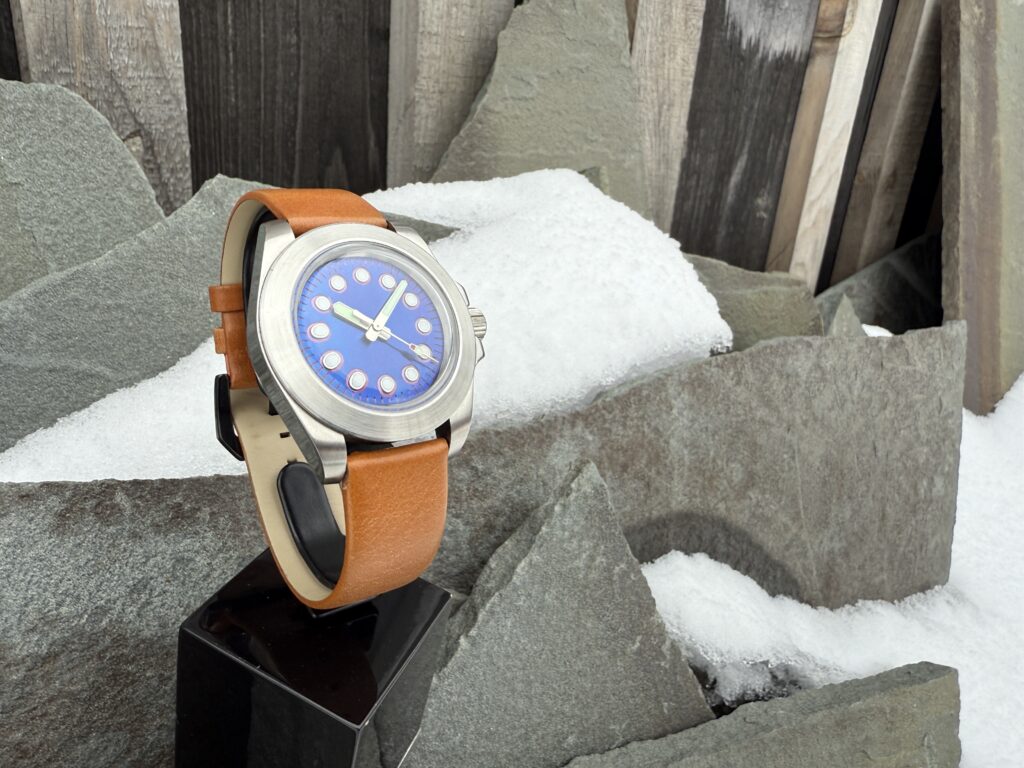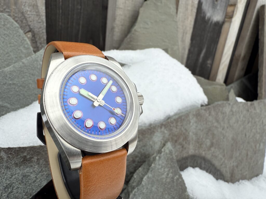 TiDi #2 is the second time gage in the Titanium Dials series. The dial is fabricated out of a sheet of titanium that has been machined on a lathe, polished, and anodized to two different voltages. There is no coating whatsoever on the dial… the vibrant blue is bare titanium with an electrically oxidized surface layer. The water proof case is stainless steel with a domed sapphire crystal, screw down crown and 40mm in diameter. The movement is a Seiko automatic, caliber 7s26.