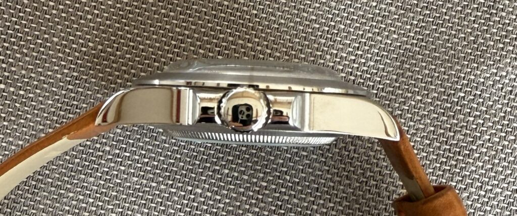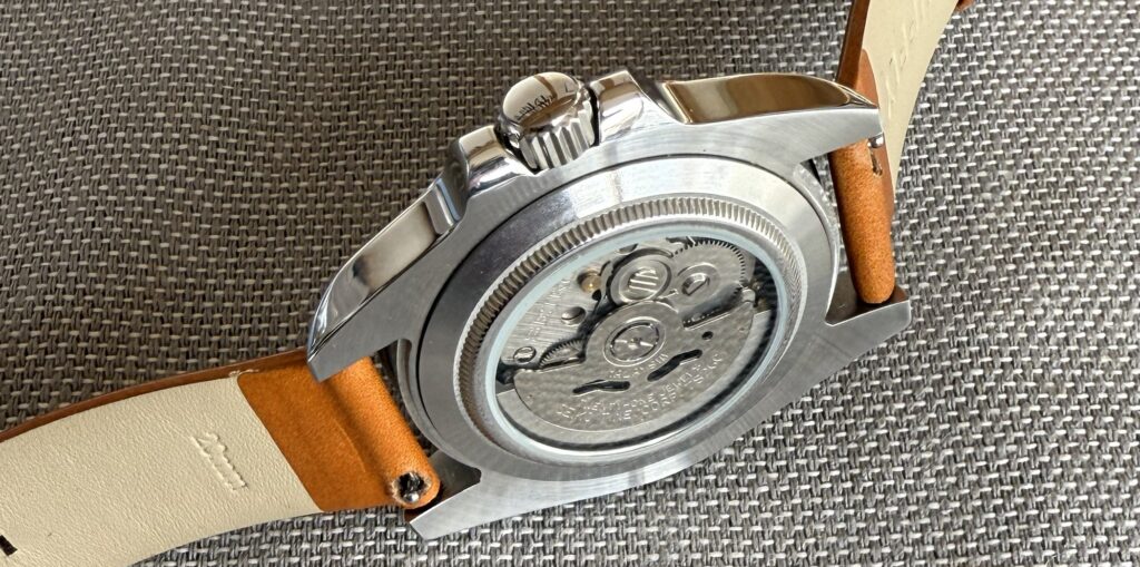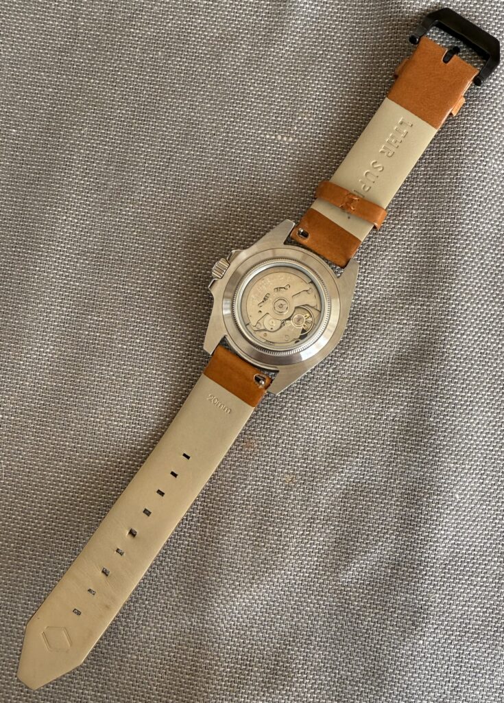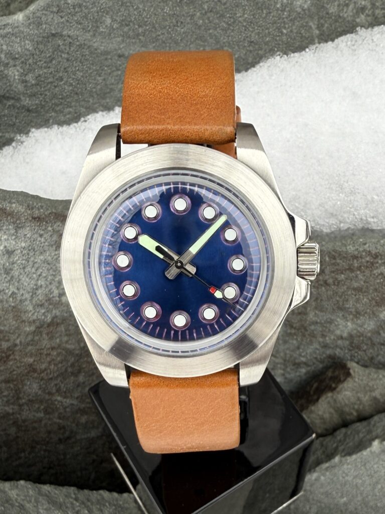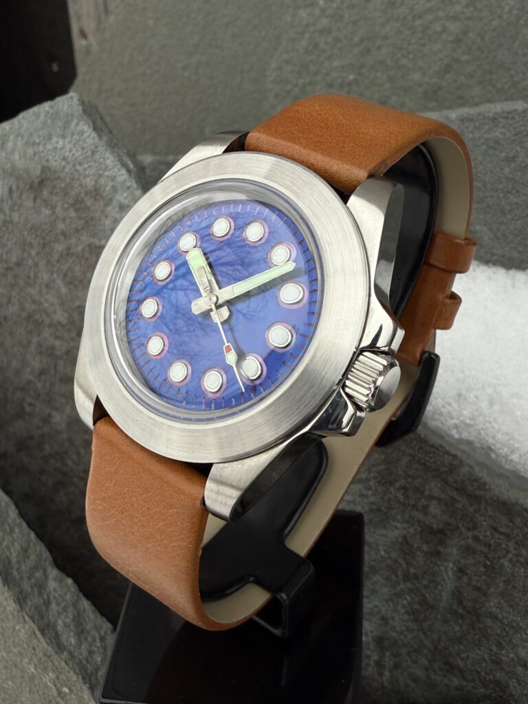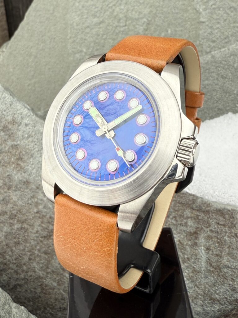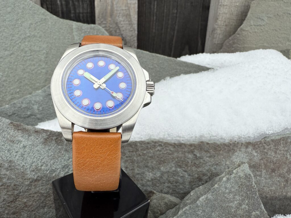 TiDi #2 is the second time gage in the Titanium Dials series. The dial is fabricated out of a sheet of titanium that has been machined on a lathe, polished, and anodized to two different voltages. There is no coating whatsoever on the dial… the vibrant blue is bare titanium with an electrically oxidized surface layer. The water proof case is stainless steel with a domed sapphire crystal, screw down crown and 40mm in diameter. The movement is a Seiko automatic, caliber 7s26.